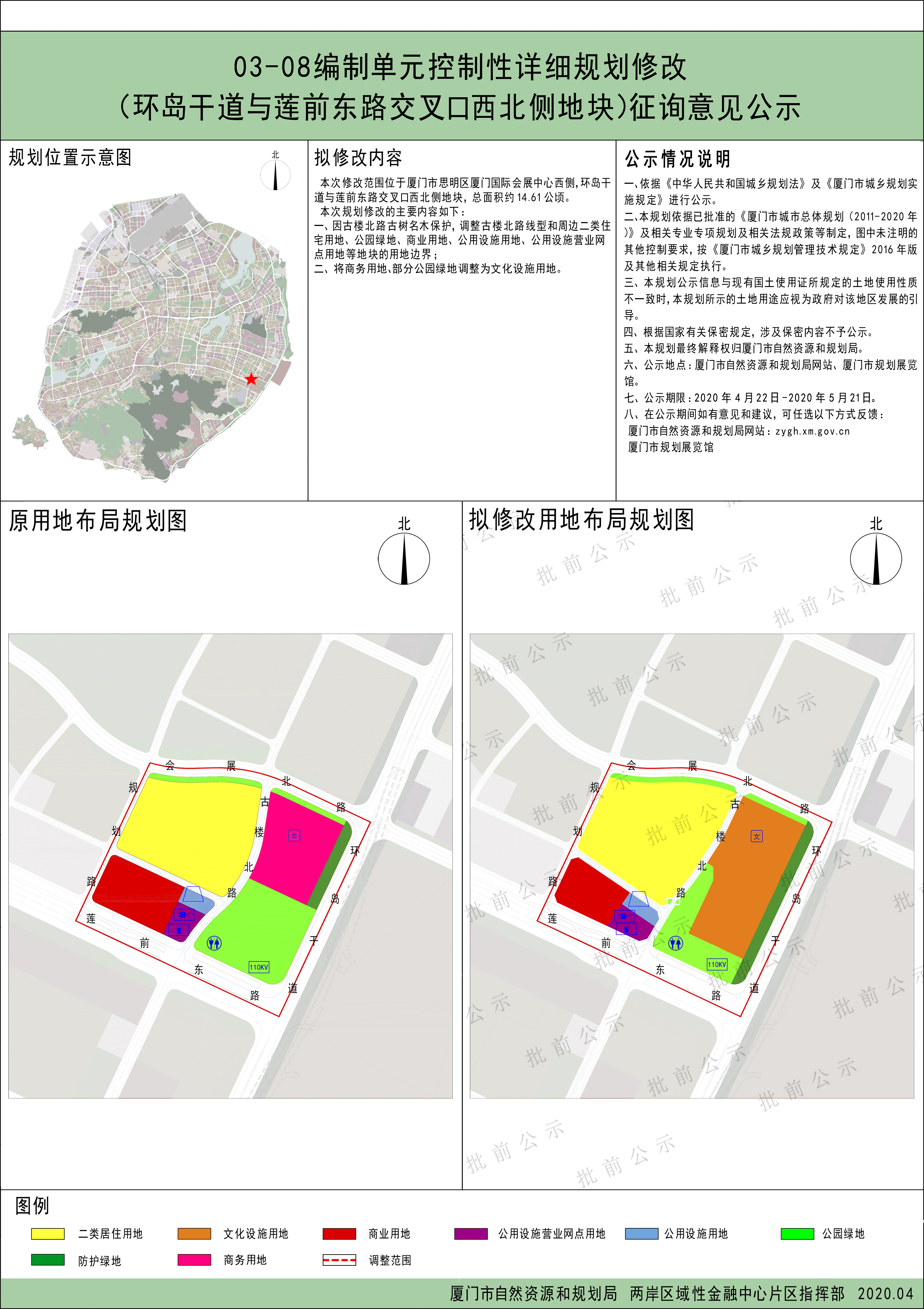 此次修改范围位于思明区厦门国际会展中心西侧,环岛干道与莲前东路交叉口西北侧地块,总面积约14.61公顷。