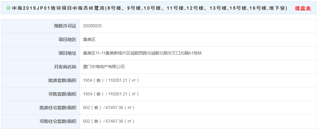 中海2019jp01地块项目中海杏林鹭湾(8号楼、9号楼,10号楼、11号楼,12号楼、13号楼,15号楼,16号楼,地下室)获批预售! 该项目位于集美区11-11集美新城片区诚毅西路与诚毅北路交叉口北侧a1地块,此次获批预售1954套,面积110281.21㎡,其中获批预售住宅602套,面积 67487.36㎡。