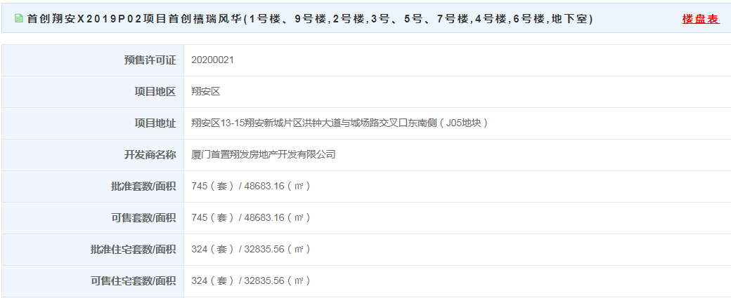 首创翔安x2019p02项目首创禧瑞风华(1号楼、9号楼,2号楼,3号、5号、7号楼,4号楼,6号楼,地下室)获批预售! 该项目位于翔安区13-15翔安新城片区洪钟大道与城场路交叉口东南侧(j05地块)。获批预售745套,面积48683.16㎡,其中获批预售住宅324套,面积32835.56㎡,复式108套,平层216套。