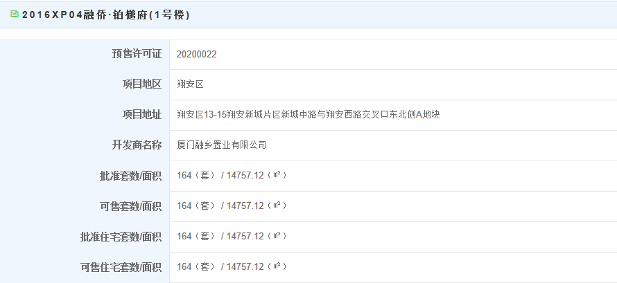 2016xp04融侨·铂樾府(1号楼)获批预售,该项目位于翔安区13-15翔安新城片区新城中路与翔安西路交叉口东北侧a地块,此次获批预售住宅164套,面积达14757.12㎡,其中复式房源70套,平层94套。