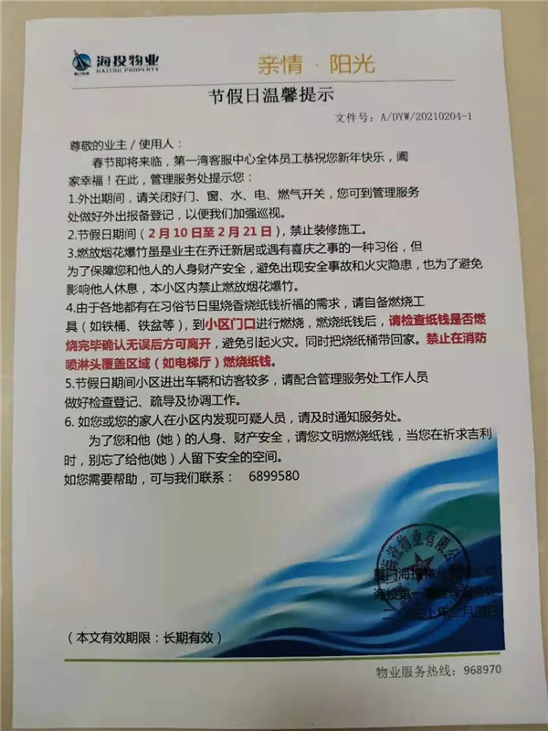 1、为了维护小区环境,给大家营造一个舒适、安全的环境。同时为了您及他人人身安全,管理处提醒您严禁高空抛物。