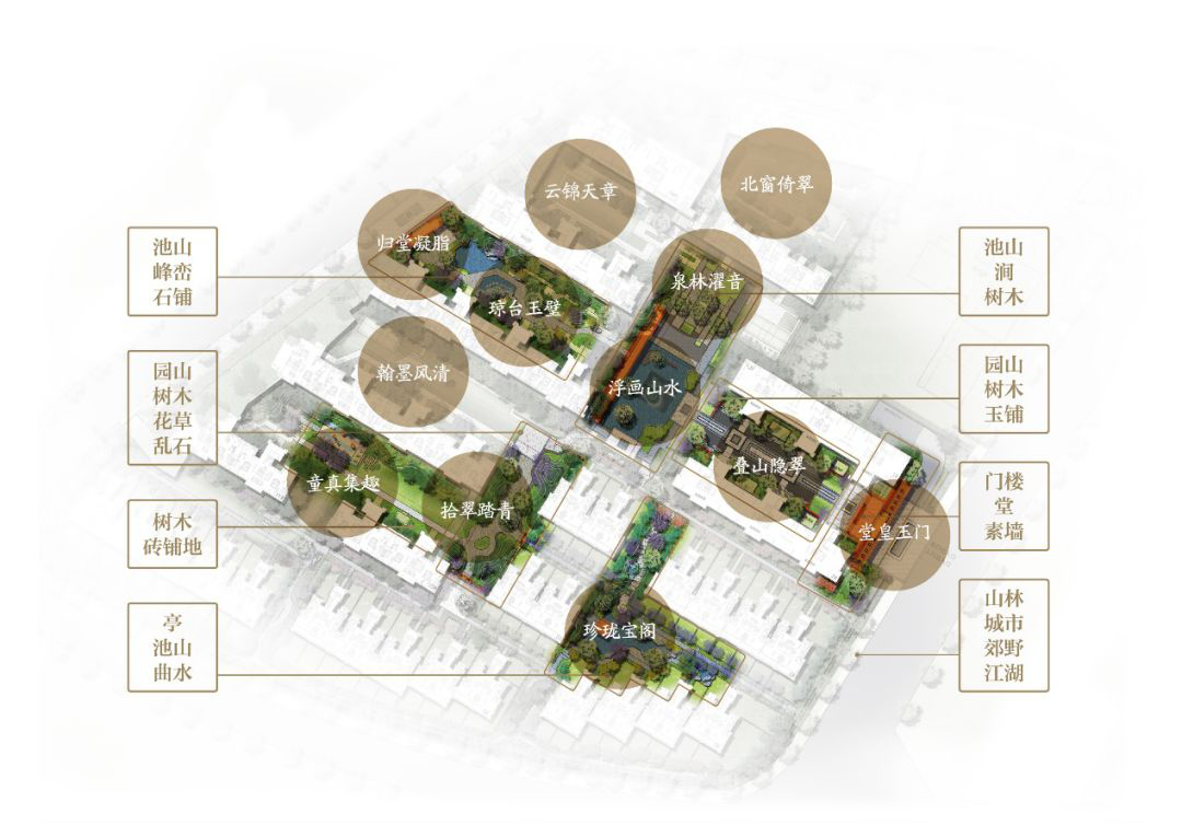 复刻赵宋园境,创四象八法二十四式,铺陈景粼十二画卷。琼台映月、千里江山琉璃壁画、苏园月洞、流云飞瀑等等,用山水园林造境诗意生活。