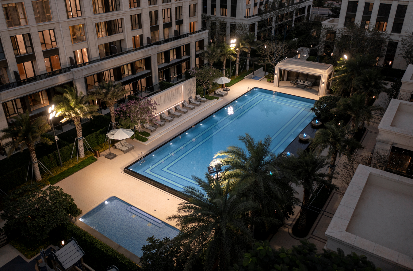 在归家动线上,从大气端庄的入口,高低错落的园林到精致的入户大堂,入口下沉式庭院,三进式漫步道、双重跌水中央水景,动静相谐,走走停停,满眼都是风景。整个园区最令人惊艳的,还属中央的“蓝宝石”无界水景,岸边是全冠移植的中东海枣,颇有东南亚度假风情。