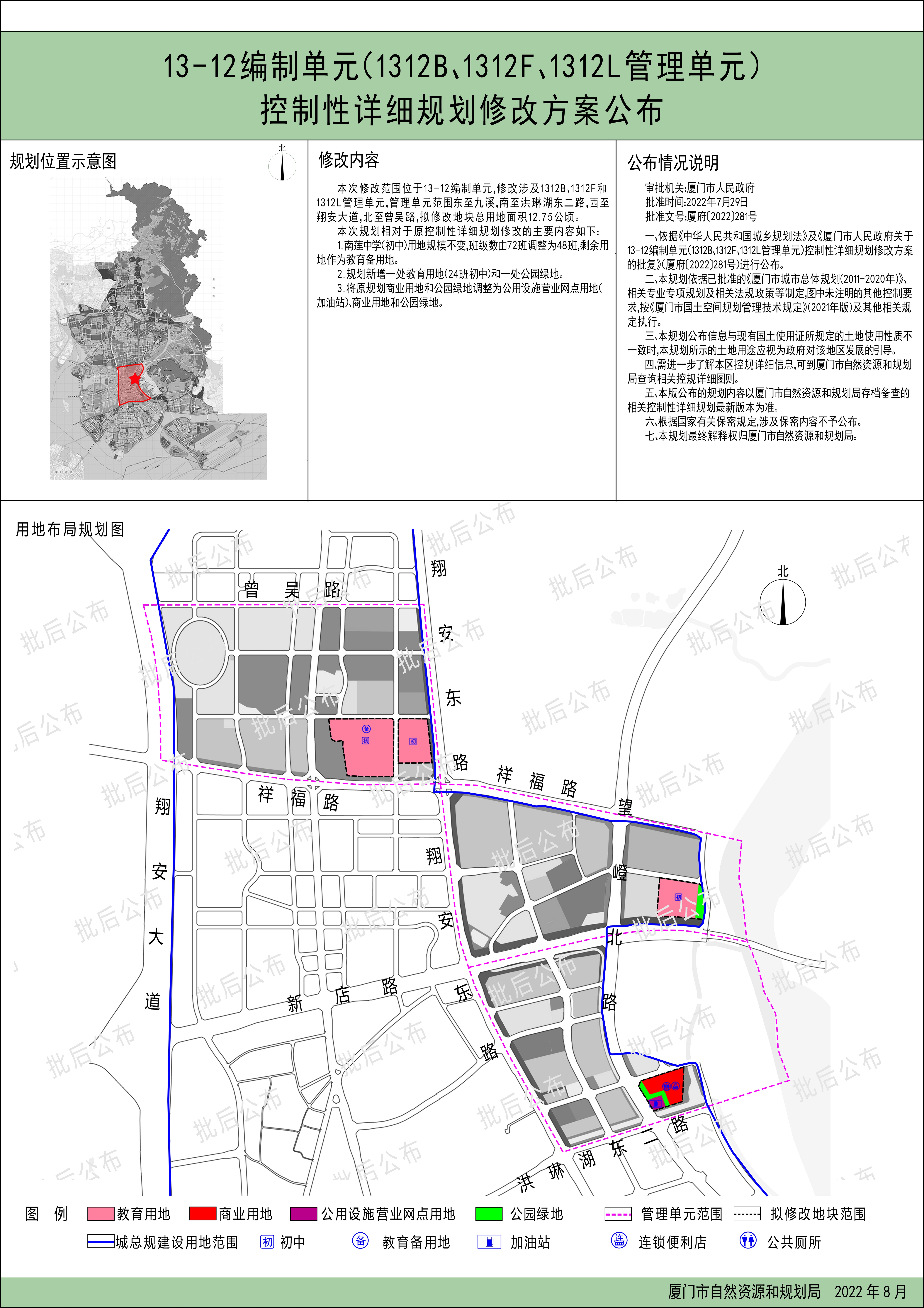 近日,厦门市自然资源和规划局发布13-12编制单元(1312b、1312f、1312l管理单元)控制性详细规划修改方案。