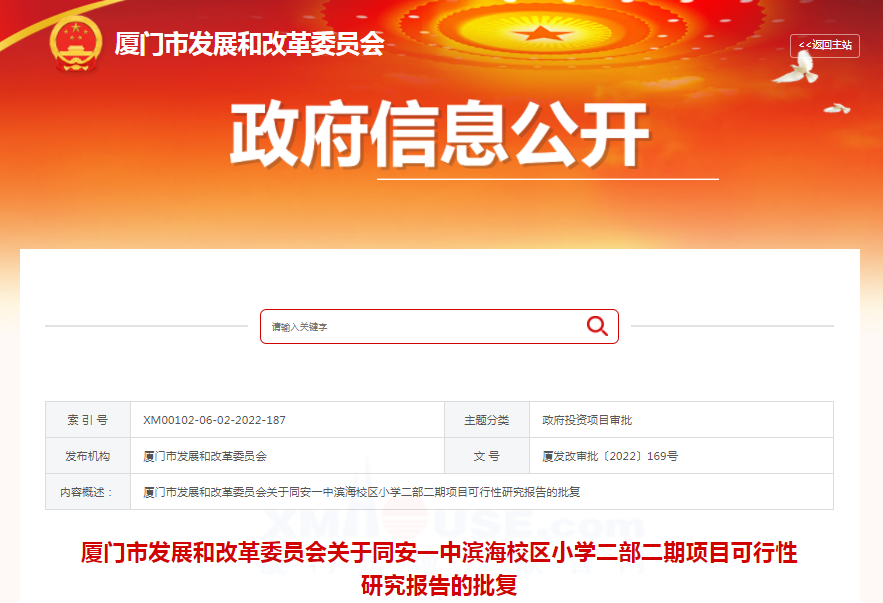 近日,厦门市发展和改革委员会发布关于同安一中滨海校区小学二部二期项目可行性研究报告的批复,同意建设同安一中滨海校区小学二部二期项目。