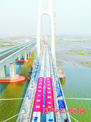 安海湾特大桥是福厦高铁全线控制性工程之一,全长9.46公里,其中,跨海区段长1.56公里,主桥为双塔双索面半漂浮体系钢混结合梁斜拉桥。据悉,这是我国高铁建设首次在跨海斜拉桥上铺设无砟轨道,投用后可实现时速350公里的高铁列车跨海过桥不减速,高铁驶过650米主桥用时将不到7秒。