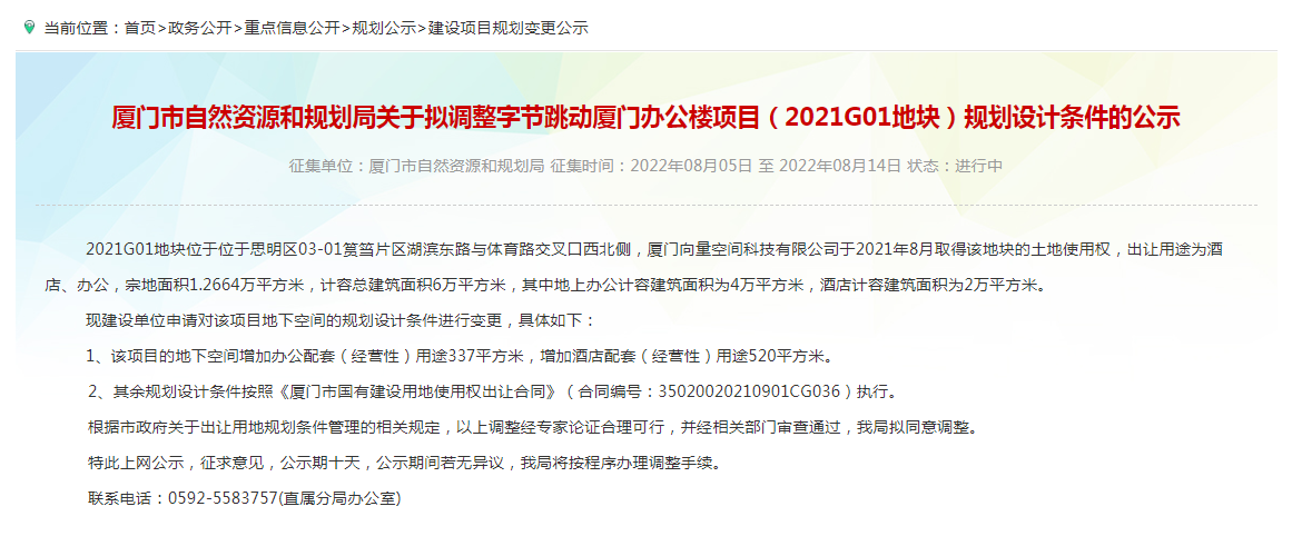 近日,厦门市自然资源和规划局发布关于拟调整字节跳动厦门办公楼项目(2021g01地块)规划设计条件的公示。