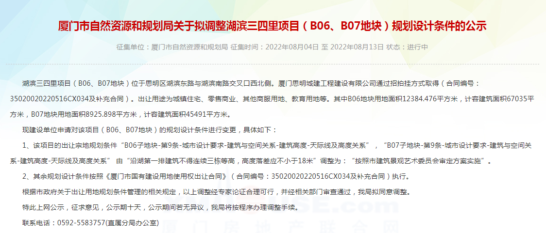 近日,厦门市自然资源和规划局关于拟调整湖滨三四里项目(b06、b07地块)规划设计条件的公示。
