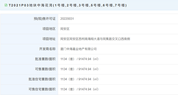t2021p03地块中海花湾(1号楼,2号楼,3号楼,5号楼,6号楼,7号楼)获批预售,项目位于同安区西柯南海翔大道与同集路交叉口西南侧。此次获批预售住宅1134套,面积91474.94㎡。