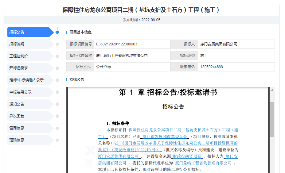 近日,保障性住房龙泉公寓项目二期(基坑支护及土石方)工程(施工)招标公告发布。