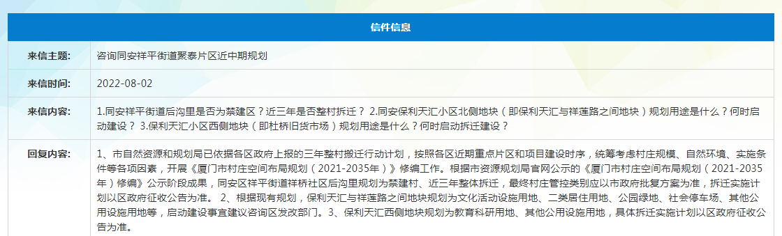 对此,厦门市自然资源和规划局答复:1、市自然资源和规划局已依据各区政府上报的三年整村搬迁行动计划,按照各区近期重点片区和项目建设时序,统筹考虑村庄规模、自然环境、实施条件等各项因素,开展《厦门市村庄空间布局规划(2021-2035年)》修编工作。根据市资源规划局官网公示的《厦门市村庄空间布局规划(2021-2035年)修编》公示阶段成果,同安区祥平街道祥桥社区后沟里规划为禁建村、近三年整体拆迁,最终村庄管控类别应以市政府批复方案为准,拆迁实施计划以区政府征收公告为准。